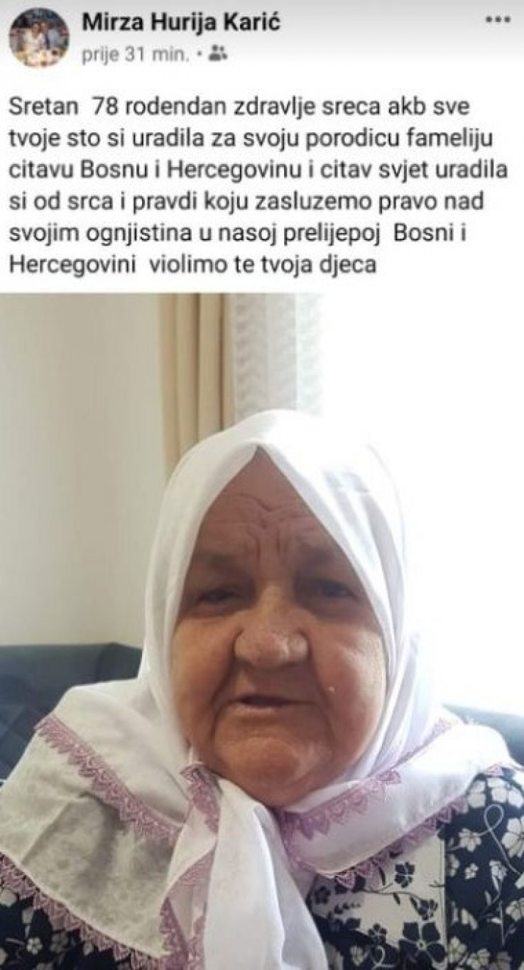 - Sretan 78. rođendan, zdravlja, sreće ako Bog da. Sve što si uradila za svoju porodicu, familiju i čitavu Bosnu i Hercegovinu i čitav svijet uradila si od srca - navela je Karić na Facebooku.