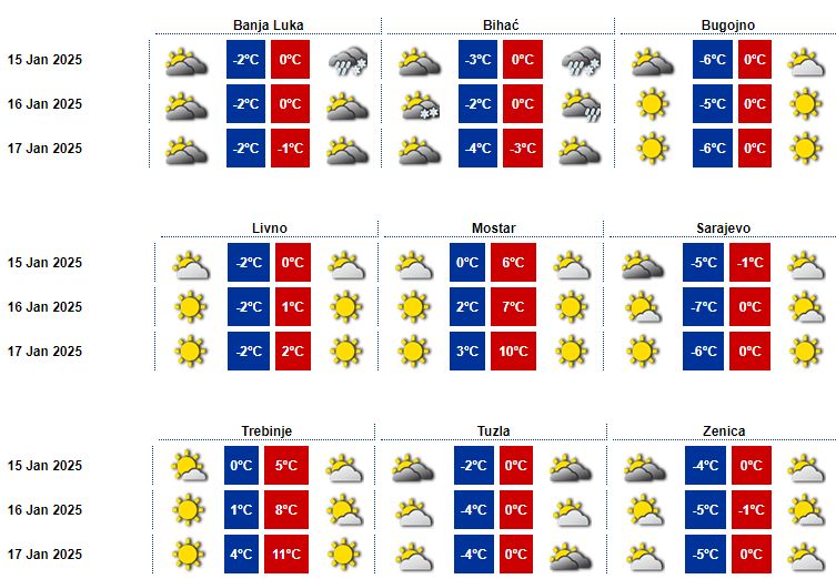 U petak, u većem dijelu Bosne preovladavaće niska oblačnost. Pretežno sunčano na području Hercegovine i jugozapadu Bosne. Vjetar slab sjevernog i sjeveroistočnog smjera. Najniža jutarnja temperatura zraka većinom između -8 i -2, na jugu zemlje do 4 stepena. Najviša dnevna temperatura zraka uglavnom između -3 i 2, na jugu zemlje od 8 do 11 Celzijusa.