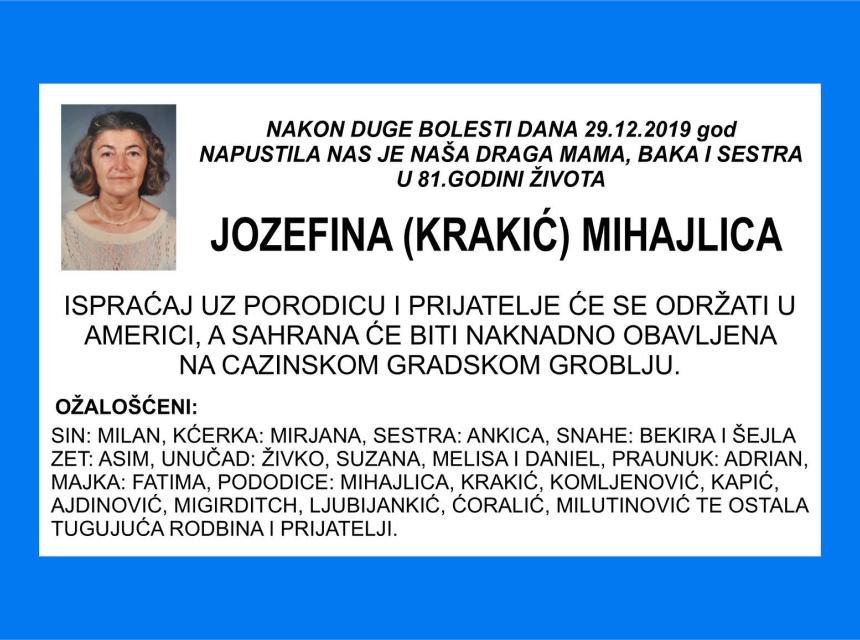 Našim posjetiteljima nudimo besplatne oglase za obavijesti o smrti. Pošaljite nam smrtovnicu osobe za koju želite dati oglas na mail info@cazin.net ili porukom u inbox Facebook stranice cazin.net, koju ćemo blagovremeno objaviti putem portala Cazin.NET