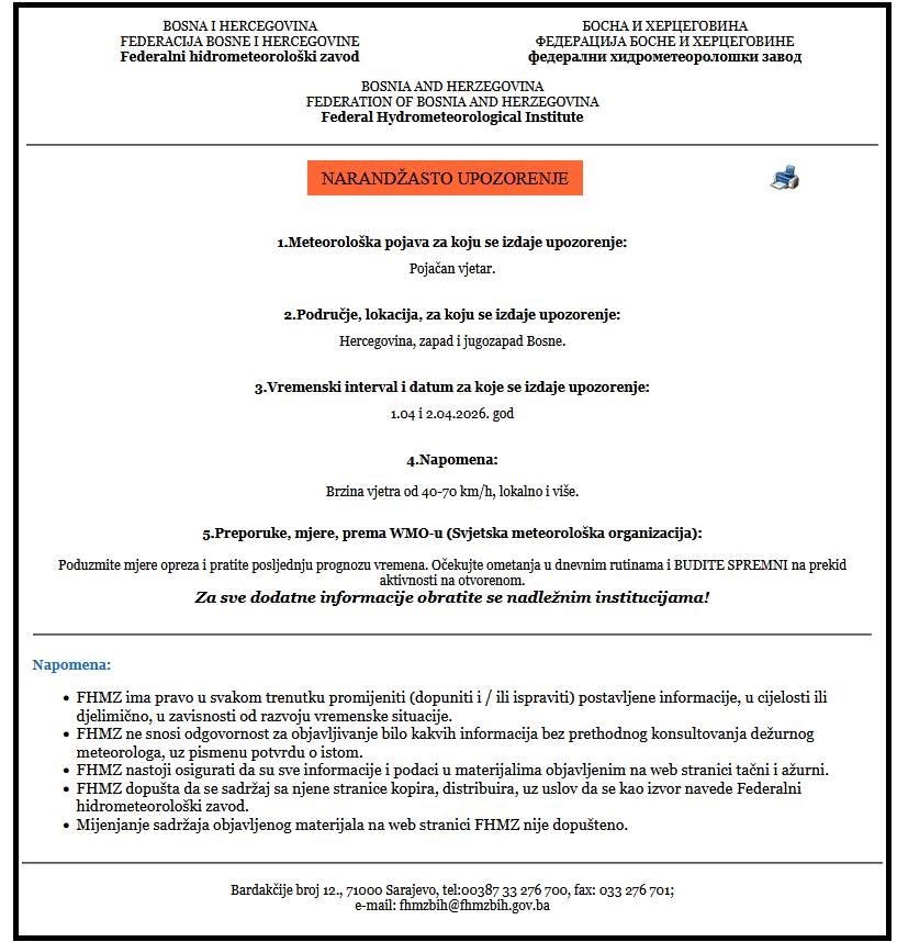 Prema zvaničnim informacijama, upozorenje se odnosi na područje Hercegovine, kao i zapad i jugozapad Bosne, gdje se očekuju izraženiji udari vjetra.