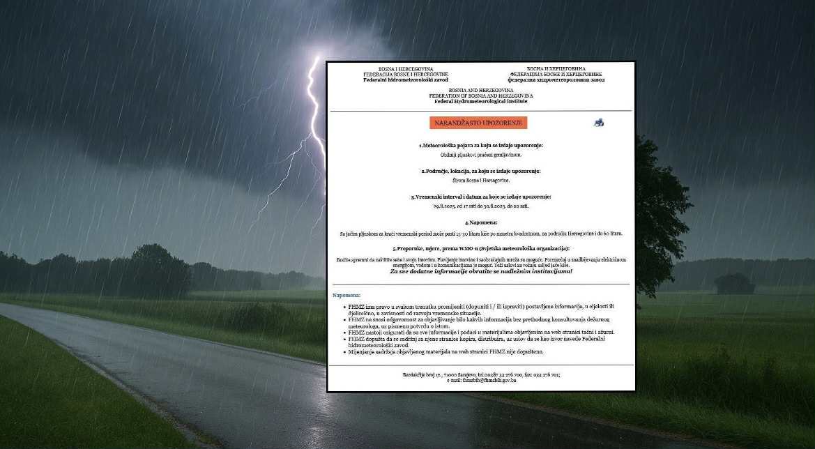 Federalni hidrometeorološki zavod Bosne i Hercegovine (FHMZ) izdao je narandžasto upozorenje zbog očekivanih obilnijih pljuskova praćenih grmljavinom na širem području Bosne i Hercegovine.
