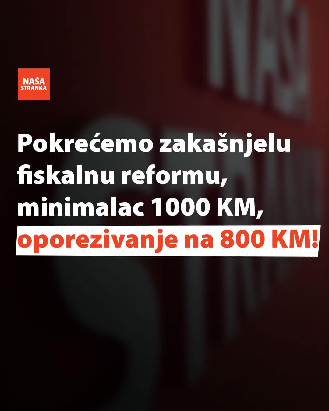 Naša stranka se oglasila saopćenjem povodom odluke o povećanju minimalne plate u Federaciji Bosne i Hercegovine na 1.000 KM, navodeći da od Ekonomsko-socijalnog vijeća traže da oporezivi dio minimalne plate ipak bude 800 KM, a da će uporedo pokrenuti fiskalne reforme.