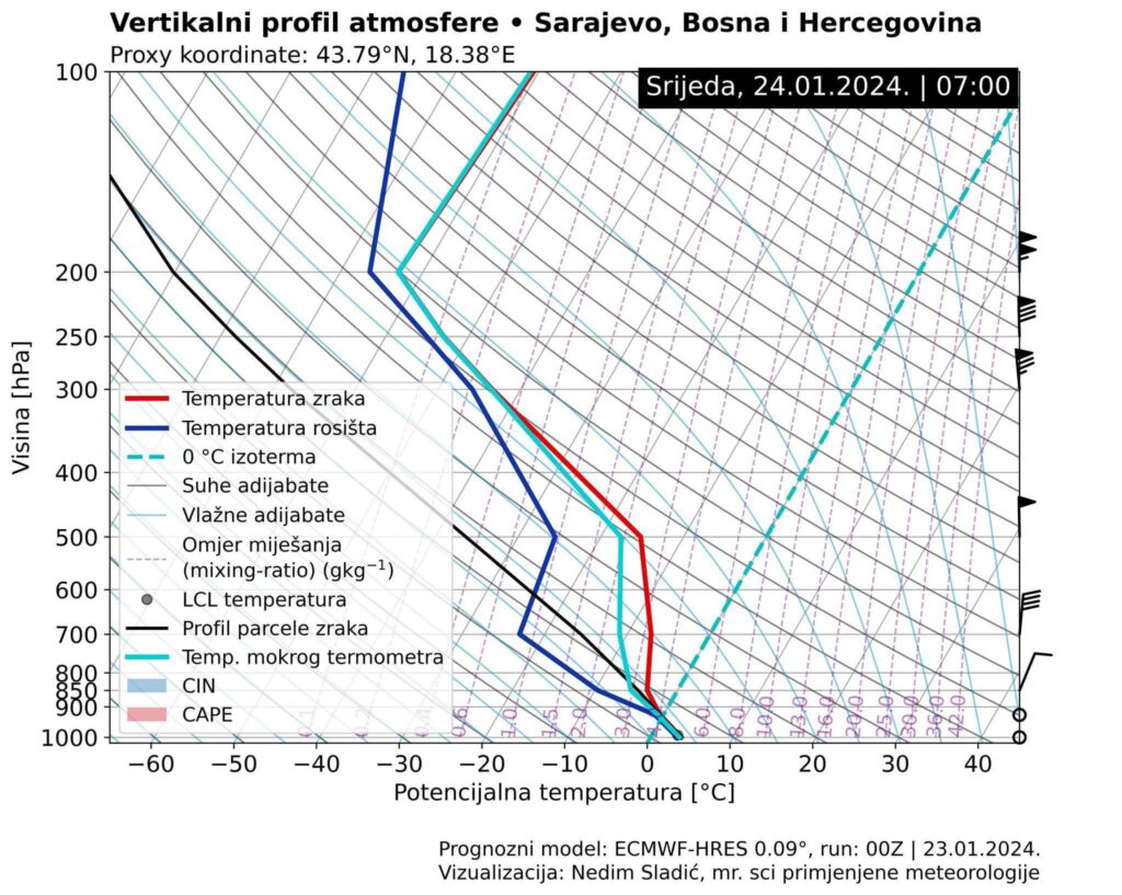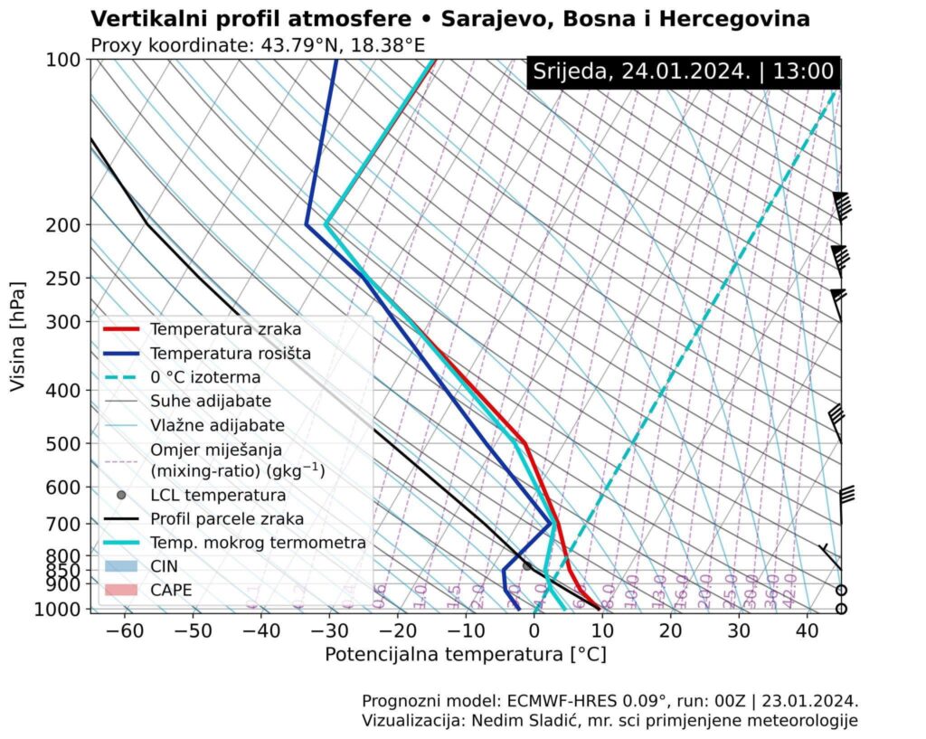 Vertikalni profil atmosfere otkriva nam da u srijedu, 24.01.2024. imamo idealne uslove za formiranje magle u sarajevskoj kotlini, naročito u nižim dijelovima grada. Slično je i u ostatku kotlinskih dijelova Bosne.
