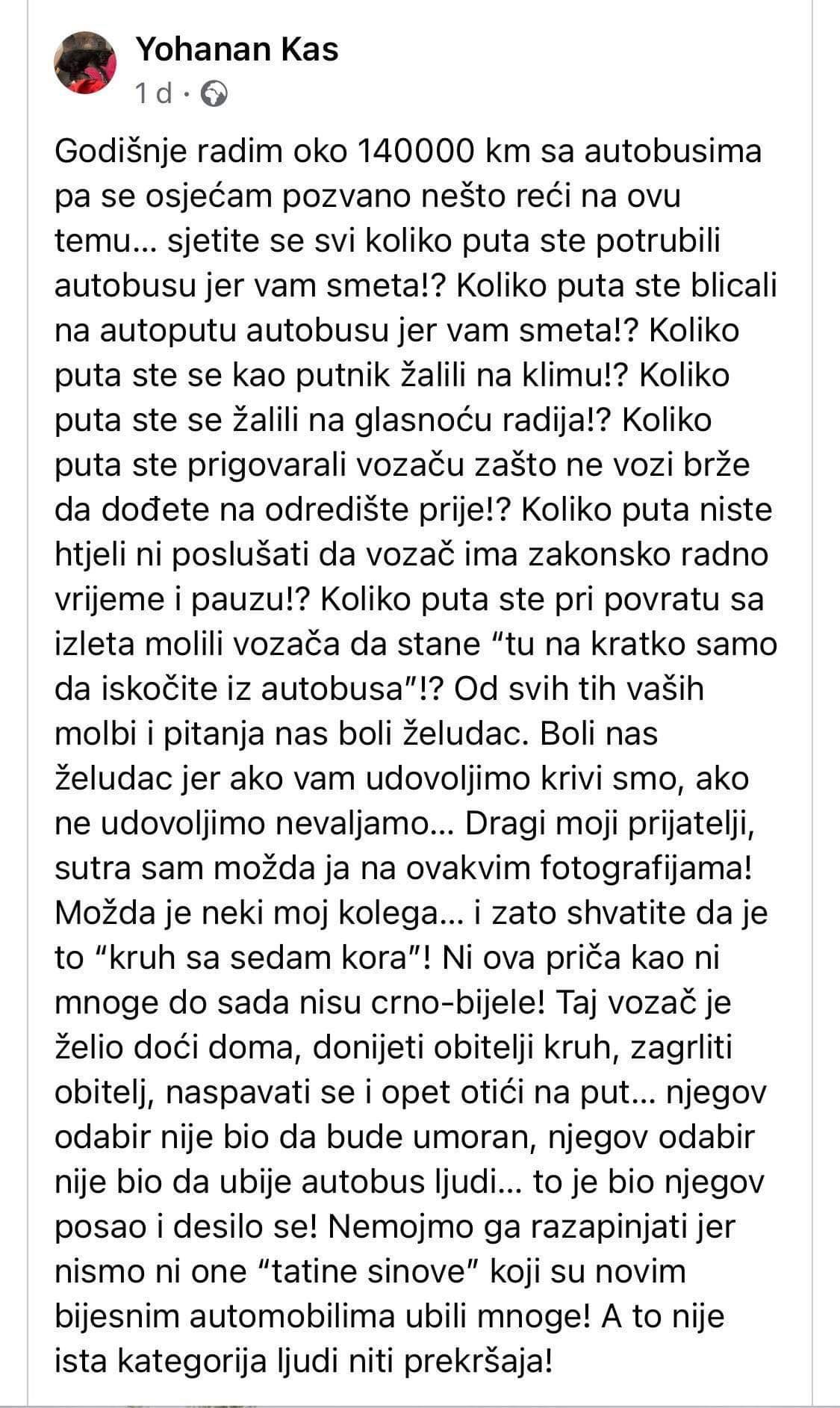 Nemojmo ga razapinjati jer nismo ni one “tatine sinove” koji su novim bijesnim automobilima ubili mnoge! A to nije ista kategorija ljudi niti prekršaja!”- objavio je na svome fb Yohana Kas, jedan od vozača autobusa, regirajući na nedavna dešavanja i tragediju autobusa sa Kosova.