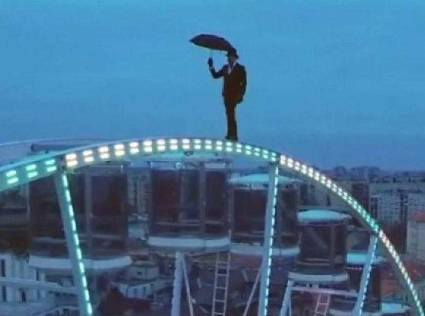 Naime, čovjek u elegantnom odijelu s kišobranom u ruci hodao je po ogromnom točku i to 45 metara iznad zemlje bez ikakvih zaštitnih pojaseva, prenosi RTL.