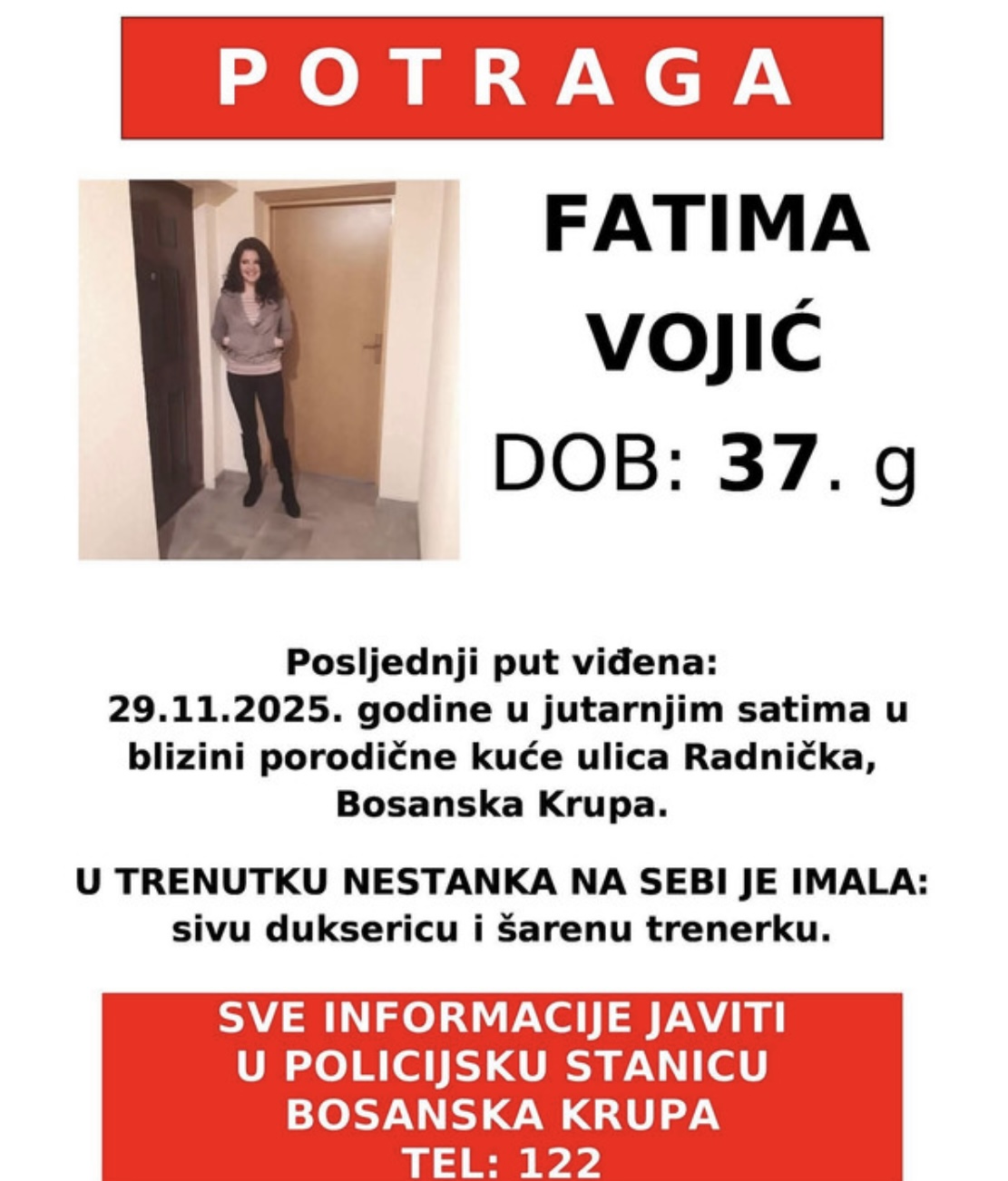 Prema informacijama porodice, Fatima je posljednji put viđena 29.11.2025. godine u ranim jutarnjim satima u blizini svoje porodične kuće u ulici Radnička u Bosanskoj Krupi. Nakon toga joj se gubi svaki trag.