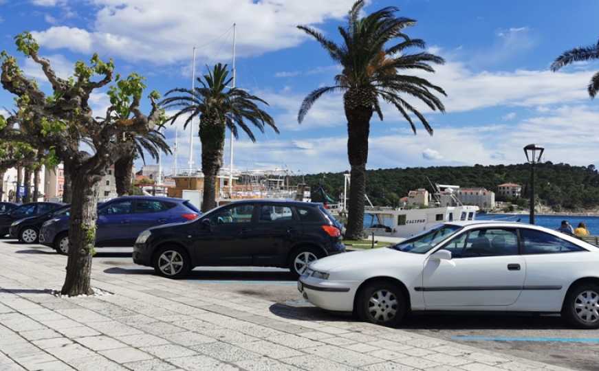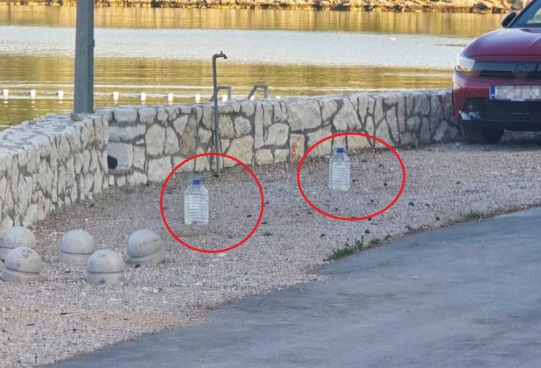 U Grebaštici kod Šibenika je snimljeno kako vlasnik vile uz pomoć kanistera s vodom i stolića pokušava sačuvati parking mjesta za svoje goste.