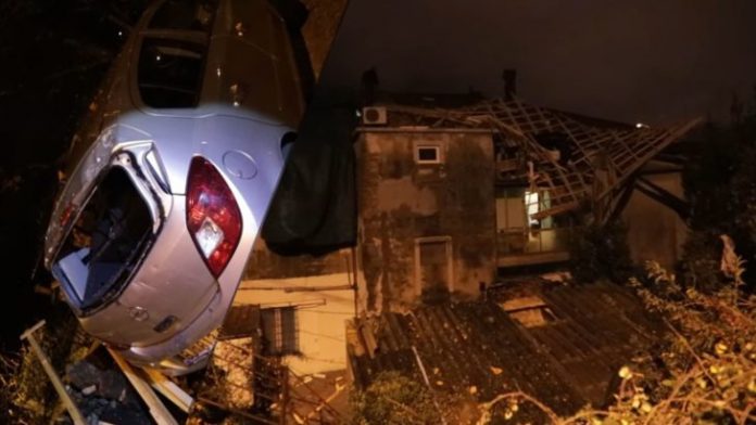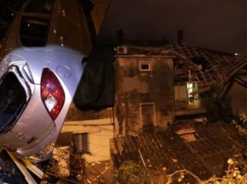 Uništena su četiri krova i automobila, a šteta je skoro na svakoj fasadi. Na teren je izašla i vatrogasna jedinica.