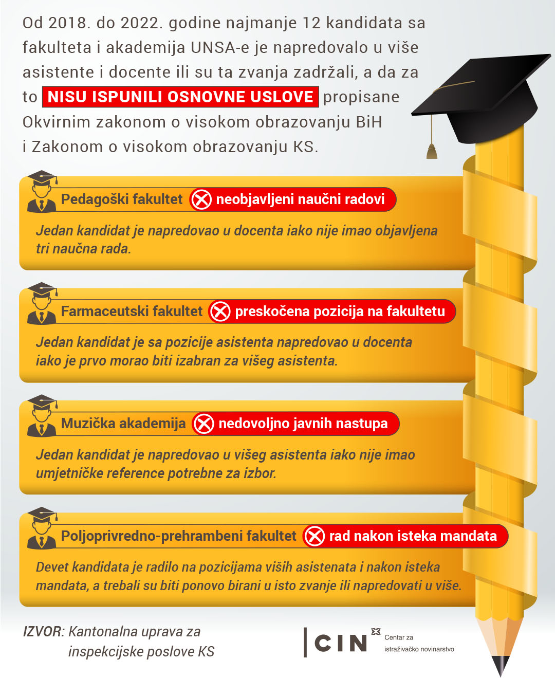 Novinari Centra za istraživačko novinarstvo (CIN) su pronašli da je od 2018. do 2022. godine najmanje 12 nastavnika i saradnika sa fakulteta i akademija napredovalo u više asistente i docente ili su ta zvanja zadržali, a da za njih nisu ispunjavali uslove. Nisu objavljivali naučne radove, preskakali su pozicije prilikom napredovanja i radili nakon isteka mandata.