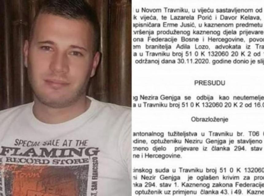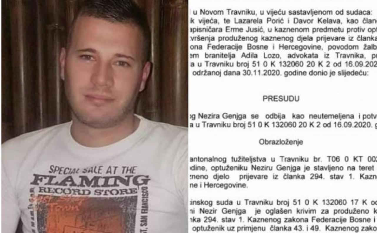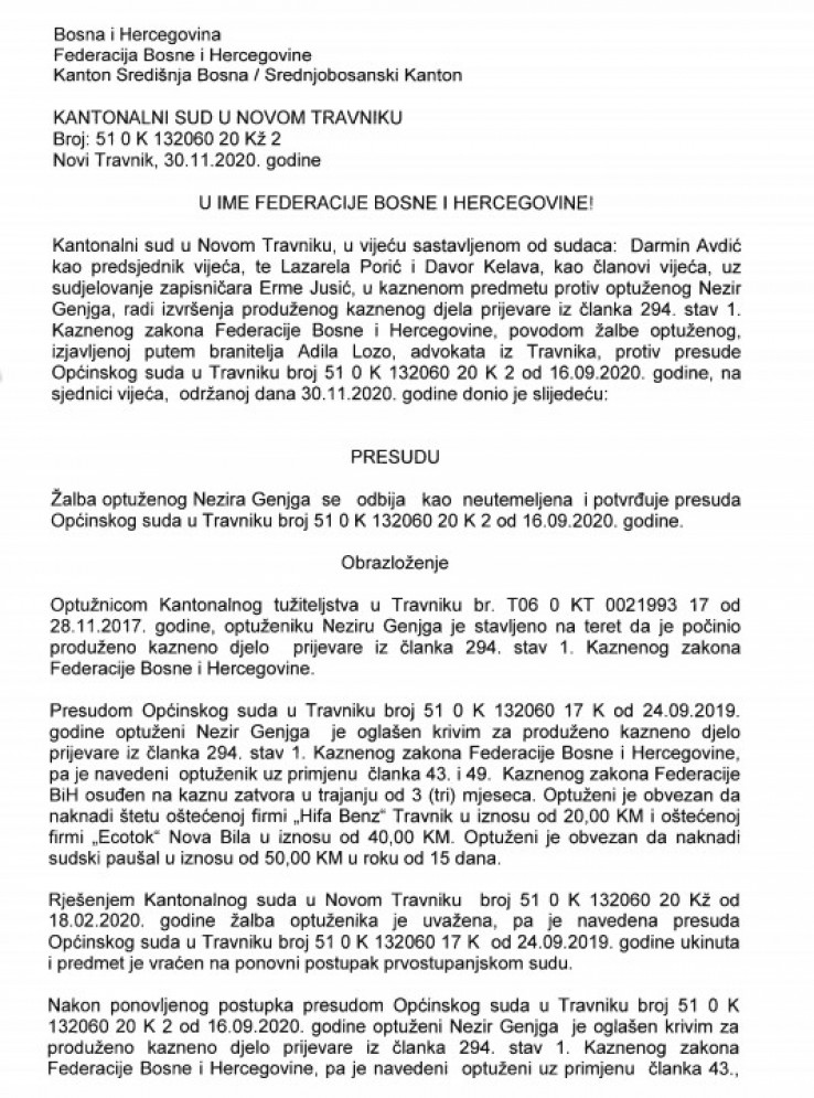 Kantonalni sud u Novom Travniku donio je u novembru prošle godine pravosnažnu presudu kojom je 25-godišnji Nezir Genjga iz Travnika osuđen na tri mjeseca zatvora zbog kako je navedeno u presudi, produženog krivičnog djela prevara.