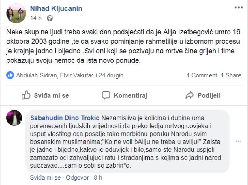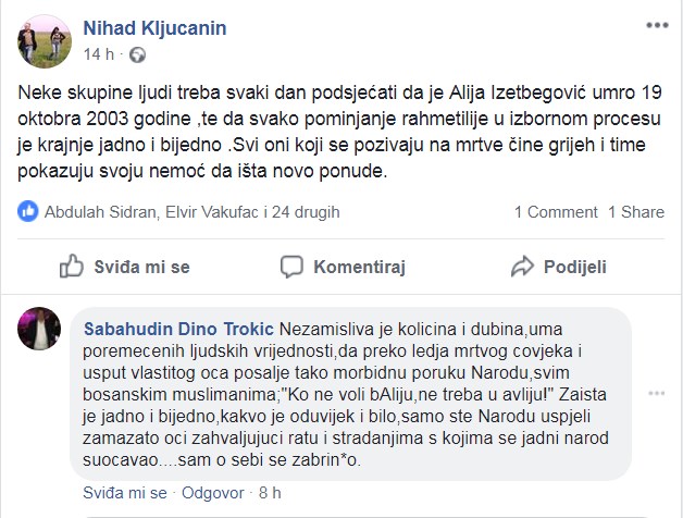 "Neke skupine ljudi treba svaki dan podsjećati da je Alija Izetbegović umro 19 oktobra 2003 godine ,te da svako pominjanje rahmetilije u izbornom procesu je krajnje jadno i bijedno .Svi oni koji se pozivaju na mrtve čine grijeh i time pokazuju svoju nemoć da išta novo ponude."
