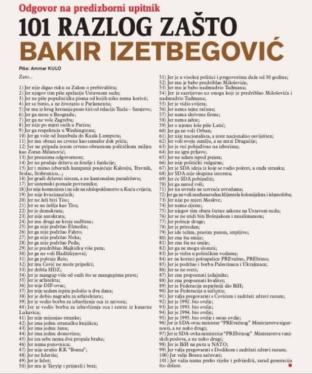 Iako na prvu djeluje kao šala ili dobra fotomontaža, redakcija Stava je svojim čitateljima, ponajviše stranačkim simpatizerima, zaista ponudila 101 stavku zbog čega smatraju da treba glasati za Bakira Izetbegovića u utrci za člana Predsjedništva BiH.