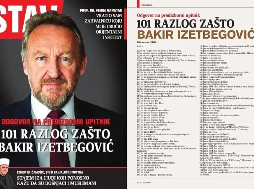 Magazin Stav, veoma blizak Stranci demokratske akcije (SDA), u svom najnovijem broju objavio je "Odgovor na predizborni upitnik" uz "101 razlog zašto Bakir Izetbegović".