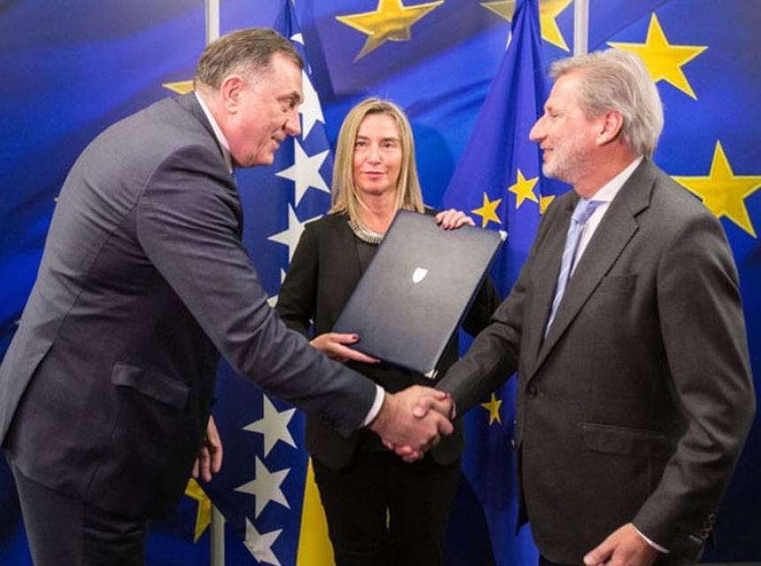Predsjedavajući Predsjedništva Bosne i Hercegovine Milorad Dodik uručio je danas komesaru za evropsku susjedsku politiku i pregovore o proširenju Johannesu Hahnu odgovore BiH na dodatna pitanja iz Upitnika Evropske komisije.