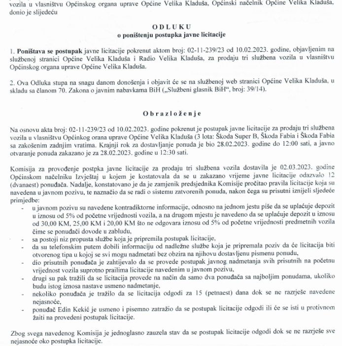 Zbog niza propusta poništen je postupak javne licitacije za prodaju tri službena vozila Općine Velika Kladuša, koji je prošli mjesec objavio načelnik Velike Kladuše Fikret Abdić.