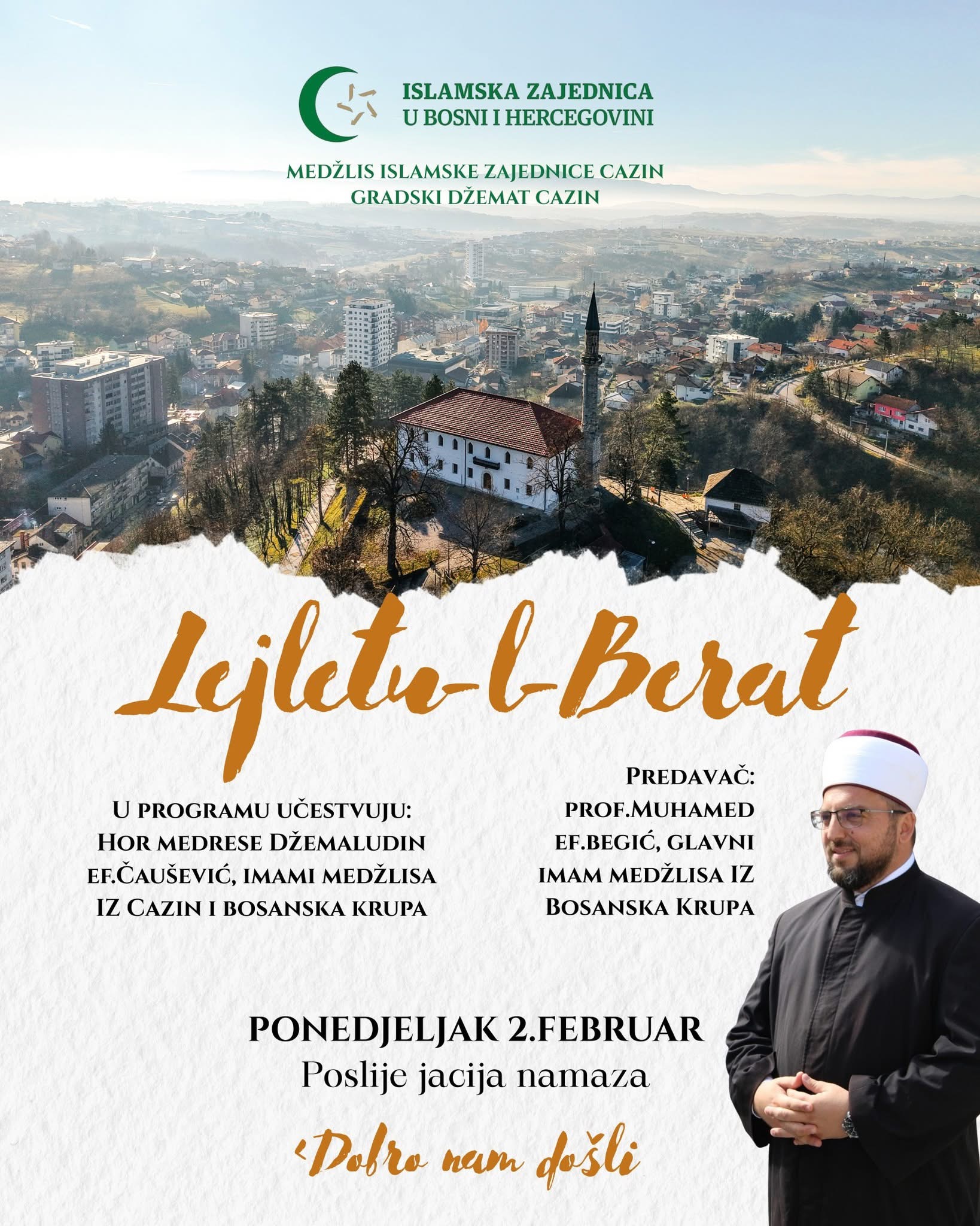 Centralni dio programa bit će predavanje prof. Muhameda-ef. Begića, glavnog imama Medžlisa Islamske zajednice Bosanska Krupa, koji će govoriti o značaju Lejletu-l-Berata, njenim porukama i poukama za savremenog vjernika.