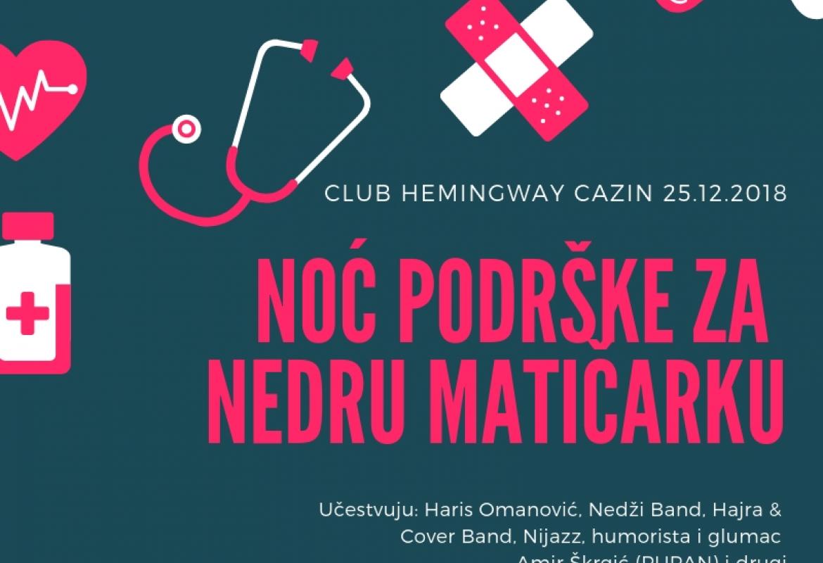 Nakon nekoliko kolačijada, u utorak, 25. decembra 2018. godine, održat će se humanitarni događaj pod nazivom Noć podrške za Nedru matičarku, a sav prihod ide za svrhe liječenja naše Cazinjanke.