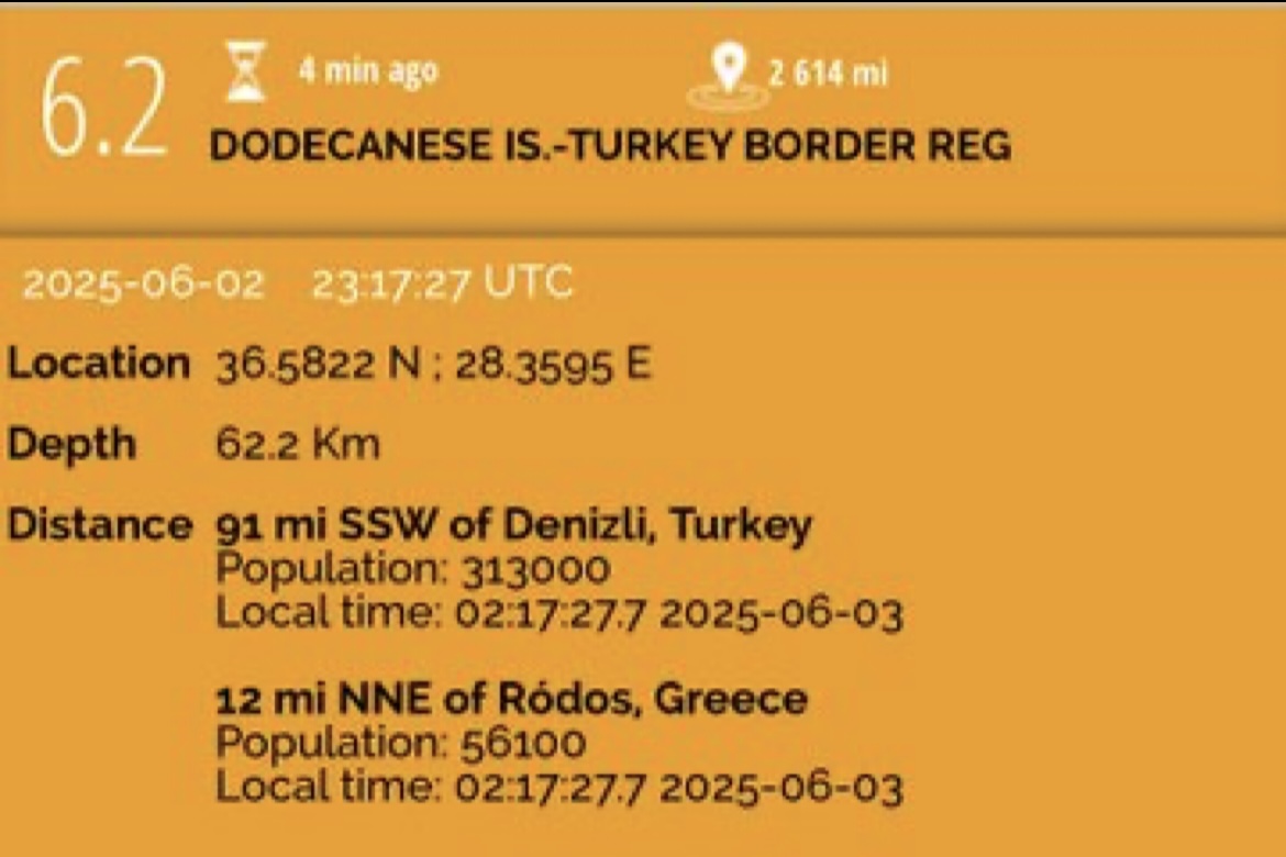 Snažan zemljotres jačine 6,2 stepena Rihterove skale potresao je jutros regiju između turske i grčke obale, sa epicentrom u blizini grčkog ostrva Rodos. Zemljotres se osjetio u Turskoj, Grčkoj, Egiptu, Siriji i drugim dijelovima regije, izazvavši paniku među stanovništvom i turistima.