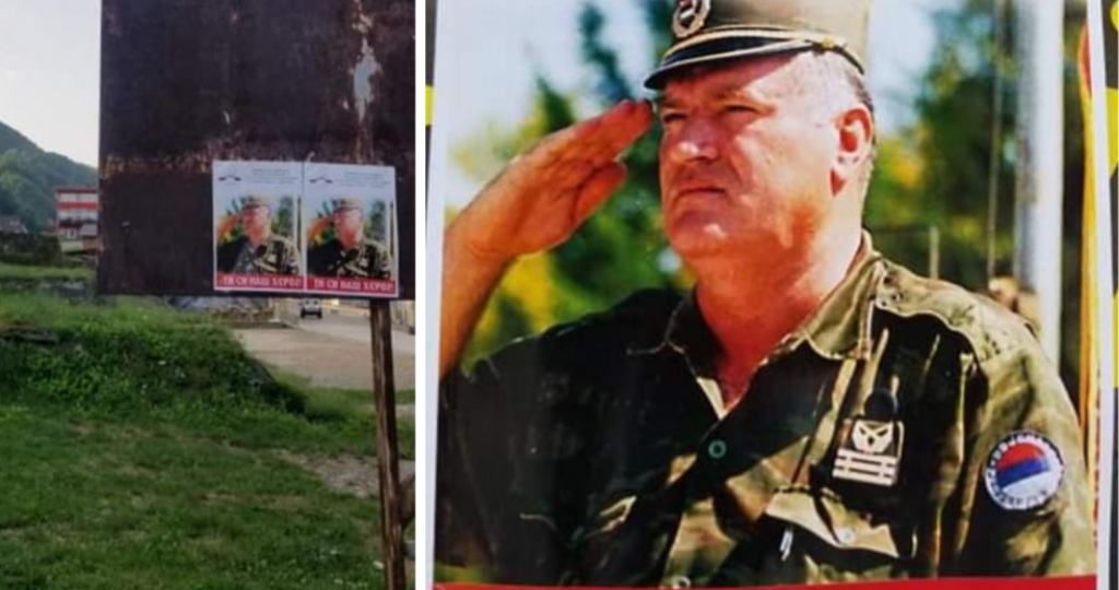 Na ovim plakatu je slika Ratka Mladića, bivšeg komandanta vojske bosanskih Srba koji je pravomoćno osuđen na doživotni zatvor zbog genocida u Srebrenici i zločina u BiH, ponovo Bošnjake u Srebrenici vrijeđa slika sa njegovim likom.