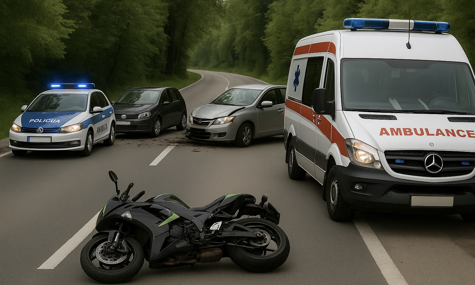 Prema prvim informacijama, u sudaru je učestvovalo više vozila: BMW, VW Sharan i motocikl marke Kawasaki.