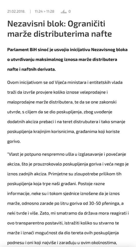 Podsjećamo, inicijativu o ograničavanju marže na gorivo i pojeftinjenju istoga, podnio je Nezavisni blok još početkom 2018. godine, a u Parlament BiH je usvojen 20. februara iste godine i obvezan je vlastima da se primijeni i ograniči marže, što je Vlada FBiH donijela tek 9 , travnja 2020. Dakle, nakon skoro 27 mjeseci.