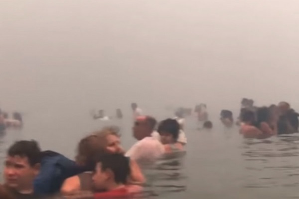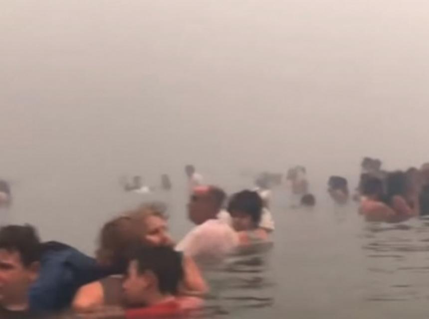 Na snimku se vide stanovnici tog mjesta koji su uspjeli da dođu do mora, nose tkaninu preko lica jer je dim iznad njih nevjerovatno gust.