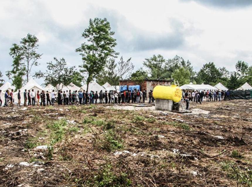 “Sunce obasjava 55 malih i dva velika šatora Crvenog krsta, u kojima dnevno boravi 450 a nekim danima i 700 izbjeglica. Oni najčešće dolaze iz Afganistana, Pakistana, Sirije, Maroka i Alžira. Na mjestima gdje je raspaljena vatra peku se pogače, iznad šatora se suši odjeća. Spavaju na na dekama na zemlji. Imaju na raspolaganju dva kontejnera za tuširanje, dva kontejnera sa WC-ima, četiri rezervoara vode, koju koriste za piće i pranje. Jednom dnevno dolazi cisterna sa svježom, pitkom vodom. ‘Ovo nije lijep kamp. Cijela finansijska pomoć stiže iz Turske a ne iz Njemačke, Francuske, Italije. Nema dovoljno hrane ni vreća za spavanje’, kaže jedan migrant. Drugi dodaje: ‘Naš plan je otići u Njemačku, Španiju ili Francusku. Tamo je moja cijela porodica. Ništa nam više ne treba. Nismo ni teroristi ni kriminalci. Trebalo mi je dva, tri mjeseca da dođem ovdje. I to sve pješke, od Pakistana do Bosne’.