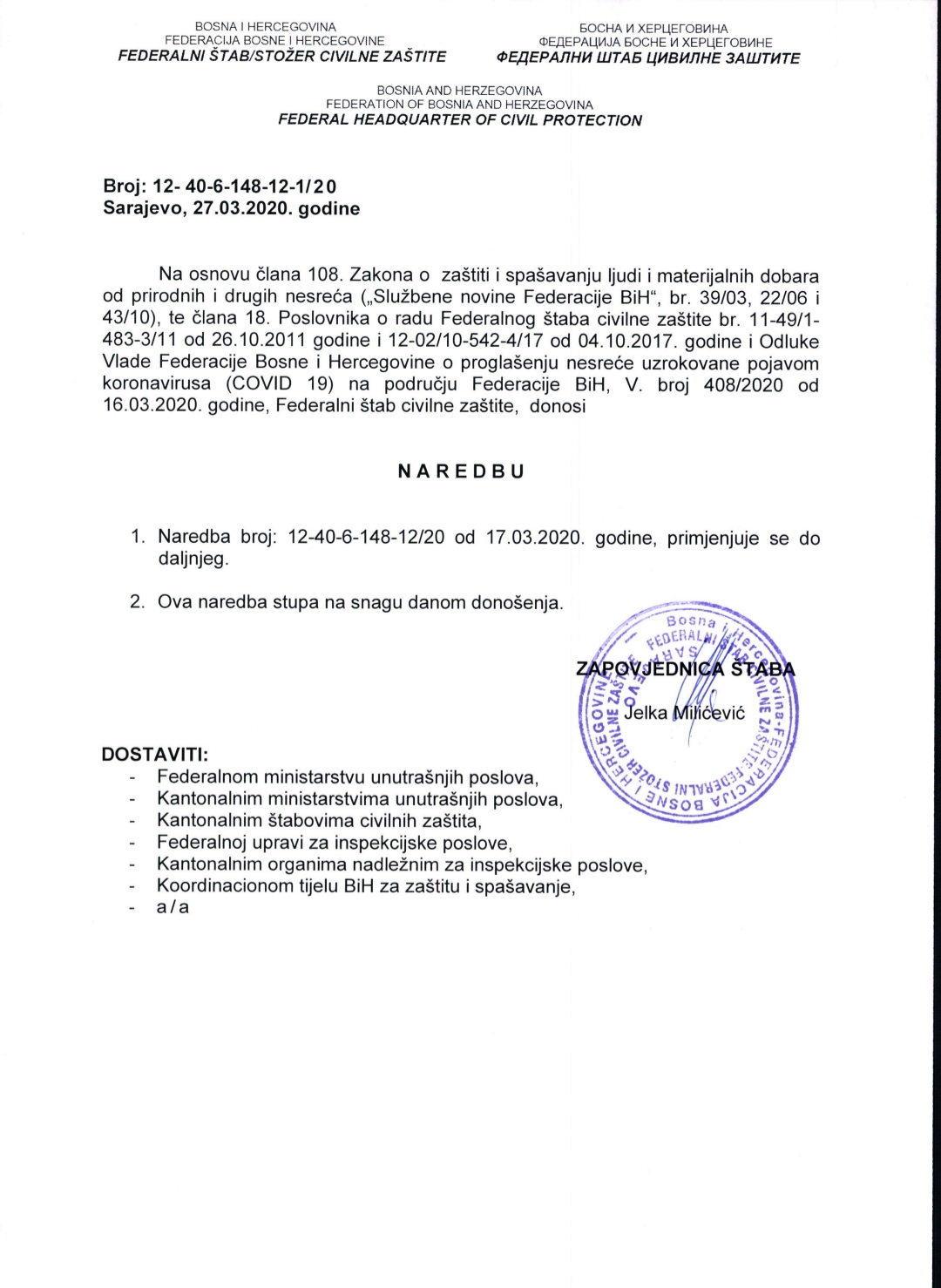 Također, obavještavamo privredne subjekte i o ranije donešenim naredbama Federalnog štaba civilne zaštite koje se produžavaju do daljnjeg, a koje se odnose na rad različitih djelatnosti.