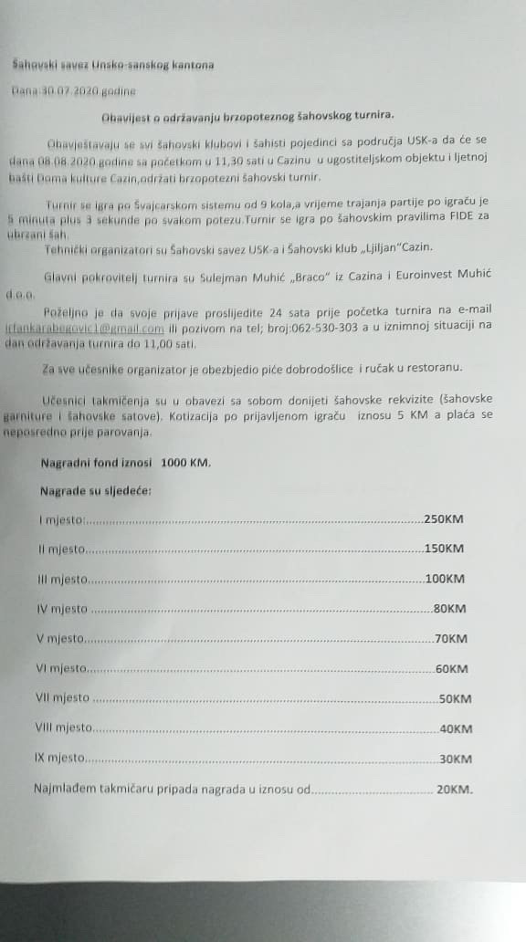 Obavještavaju se svi šahovski klubovi i šahisti pojedinci sa područja USK-a da će se dana 08.08.2020.godine sa početkom u 11:30 sati u Cazinu u ugostiteljskom objektu i ljetnoj bašti Doma kulture Cazin, održati brzopotezni šahovski turnir.