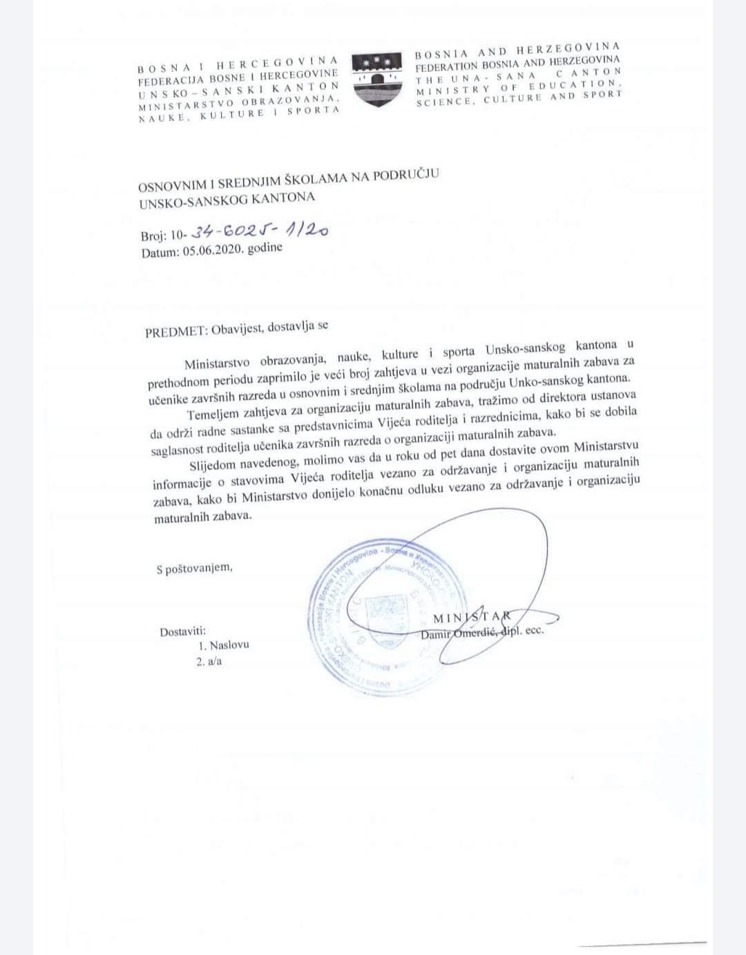 Slijedom navedenog, ministarstvo moli da se u roku od pet dana dostave informacije o stavovima Vijeća roditelja o organizaciji i održavanju maturalnih zabava kako bi ministarstvo donijelo konačnu odluku u vezi održavanja navedenih maturalnih zabava.