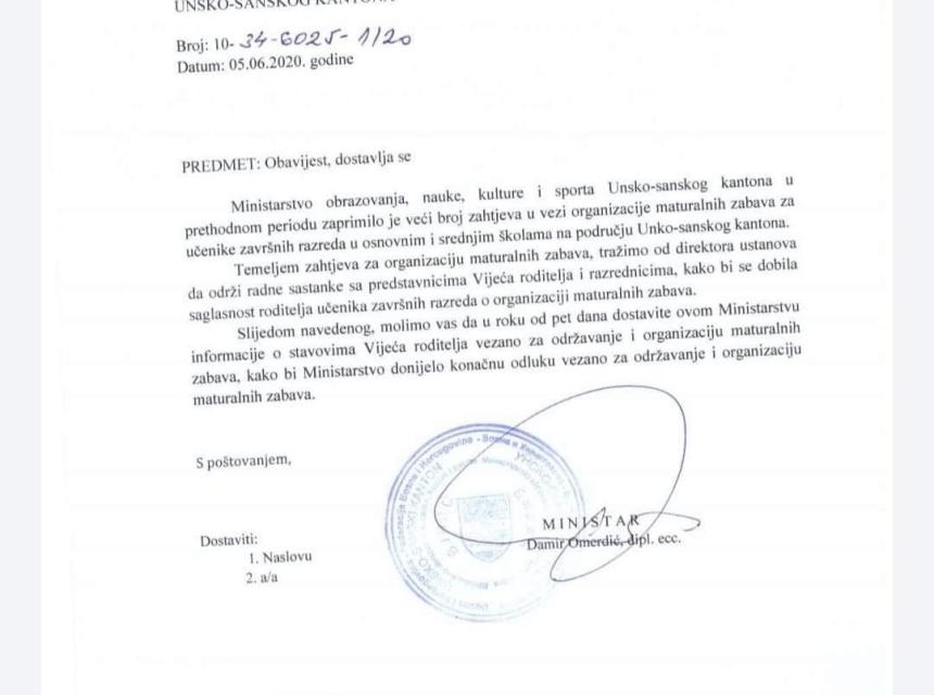 Ministarstvo obrazovanja, nauke, kulture i sporta USK zaprimilo je veći broj zahtjeva u prethodnom periodu u vezi održavanja maturalnih zabava za završne razrede osnovnih i srednjih škola na području USK.