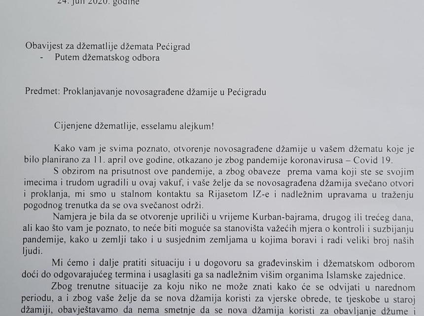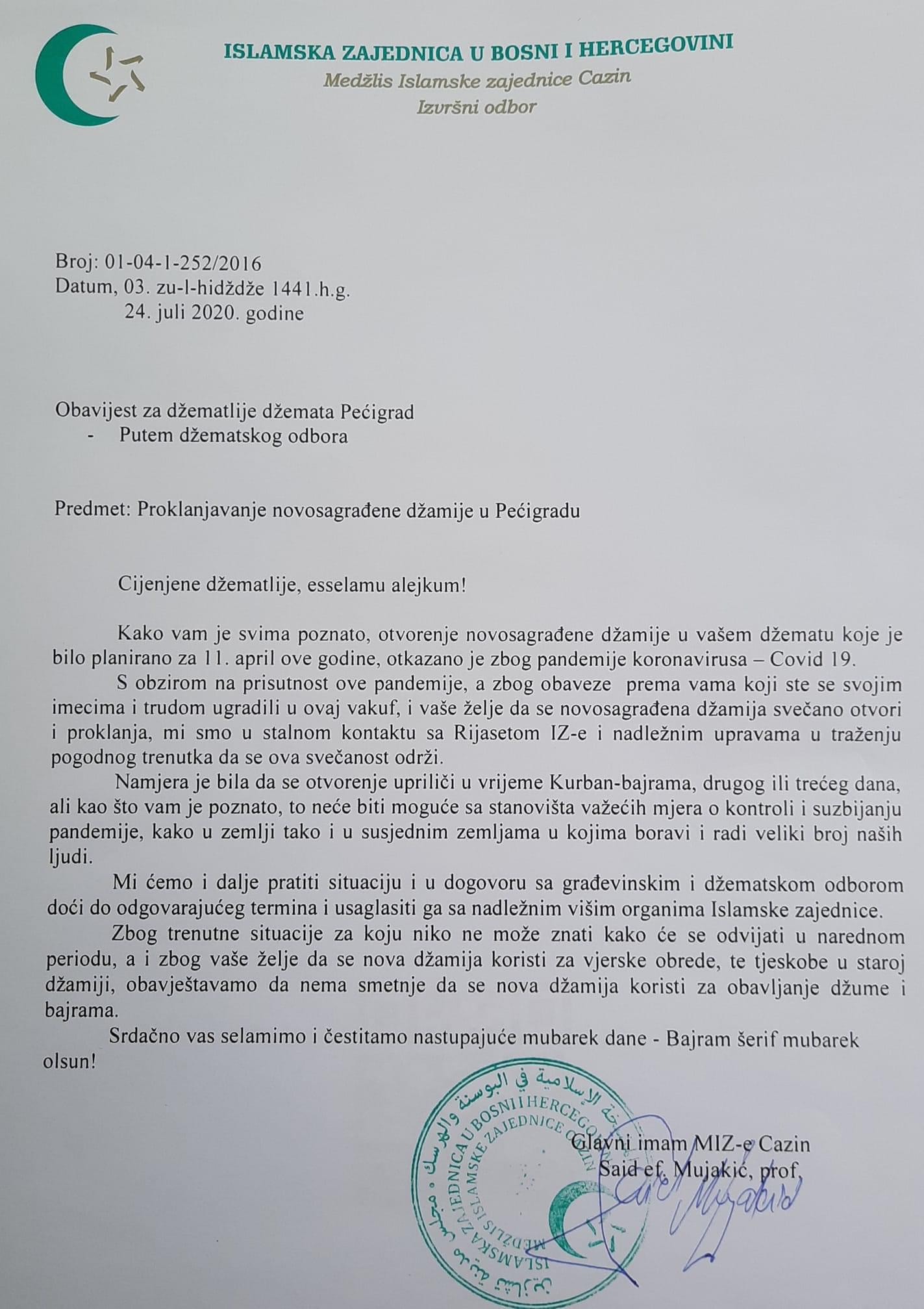Obavještavamo džematlije džemata Pećigrad i sve druge koji imaju želju da klanjaju u novoj džamiji Pećigrad da je stigla obavijest iz Medžlisa Islamske Zajednice Cazin o klanjanju u novoj džamiji.