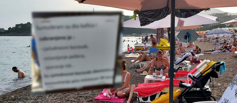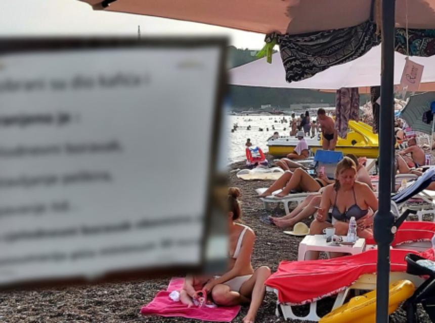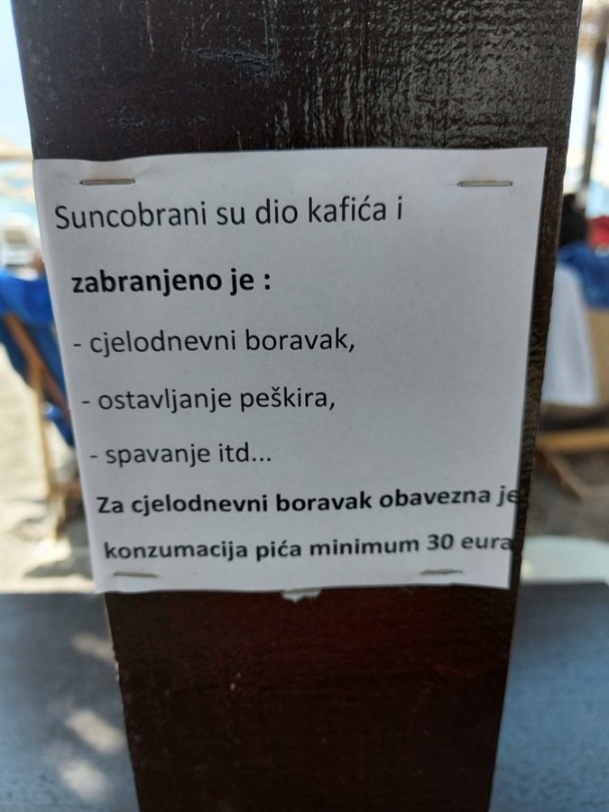 „Suncobrani su dio kafića i zabranjeno je: cjelodnevni boravak, ostavljanje peškira, spavanje…“, piše na obavještenju zakačenom na suncobran. U slučaju da ste baš riješili da ostanete, napomenuto je da je „za cjelodnevni boravak obavezna konzumacija minimum 30 eura“. Pa, koliko kafa možete da popijete?