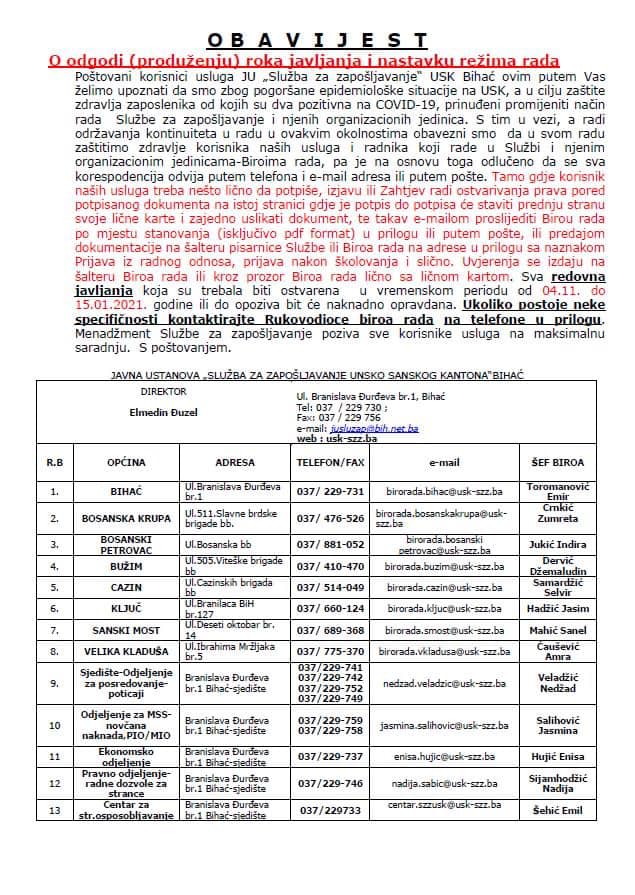 -redovna javljanja na šalterima Biroa rada gradova i općina sa područja USK, odgađaju se do 15.01.2021.godine, tj. redovna javljanja koja su trebala biti ostvarena u vremenskom periodu od 04.11. do 15.01.2021. godine ili do opoziva bit će naknadno opravdana.