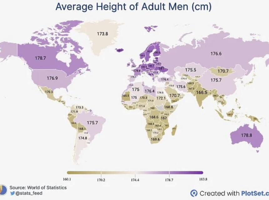 Uz listu najviših muškaraca svijeta po državama, organizacija World of Statistics predstavila je i mapu koja predstavlja prosjek visine muškaraca u svijetu.