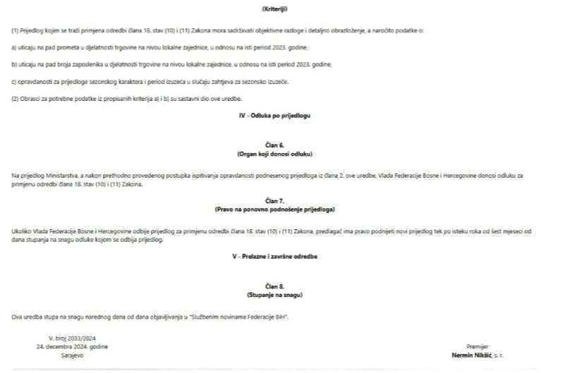 Vlada Federacije BiH donijela je Uredbu o kriterijima za primjenu odredbi Zakona o unutrašnjoj trgovini koji, između ostalog, nalaže neradnu nedjelju za većinu privrednih subjekata na tlu FBiH.