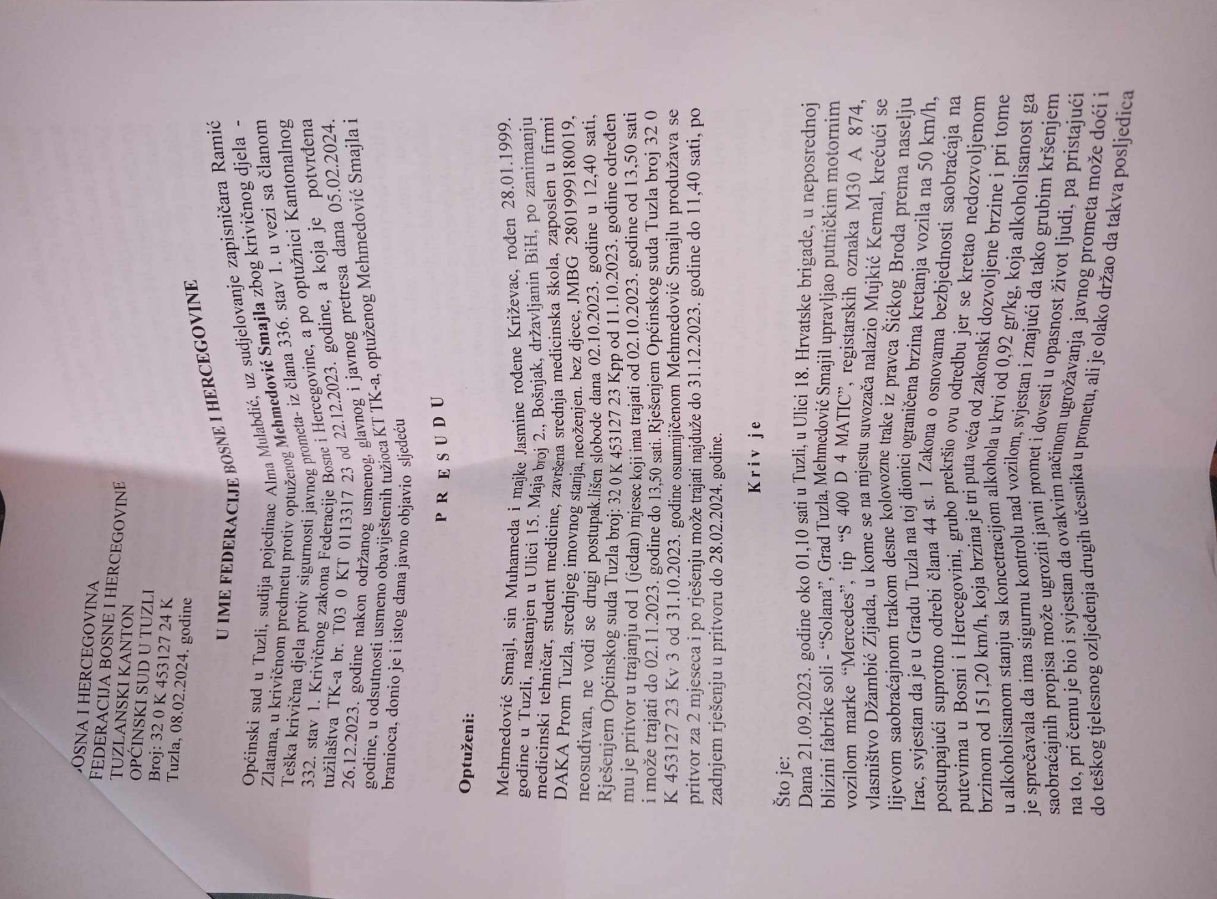 Par mjeseci kasnije sud u Tuzli donio je sramotnu presudu. Za sve što je učinio u navedenoj noći, Mehmedović je “nagrađen” sa godinom dana zatvora i 3 godine zabrane upravljanja motornim vozilom. U navedenu kaznu je uračunato i vrijeme provedeno u pritvoru. Da bi sramota bila još veća, Mehmedović se i dalje, prema objavama sa društvenih mreža, nalazi na slobodi.