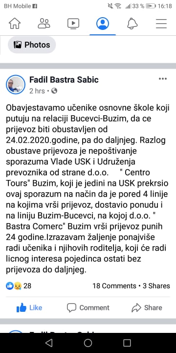 Zbog nepoštivanja sporazuma Vlade USK i Udruženja prevoznika od strane "Centro Tours" d.o.o. Bužim, a koji je ujedno i jedini prekršio ovaj sporazum, osnovci koji koriste ovaj prijevoz su ostali uskraćeni za isti od danas (24.02.2020.) pa do daljnjeg.