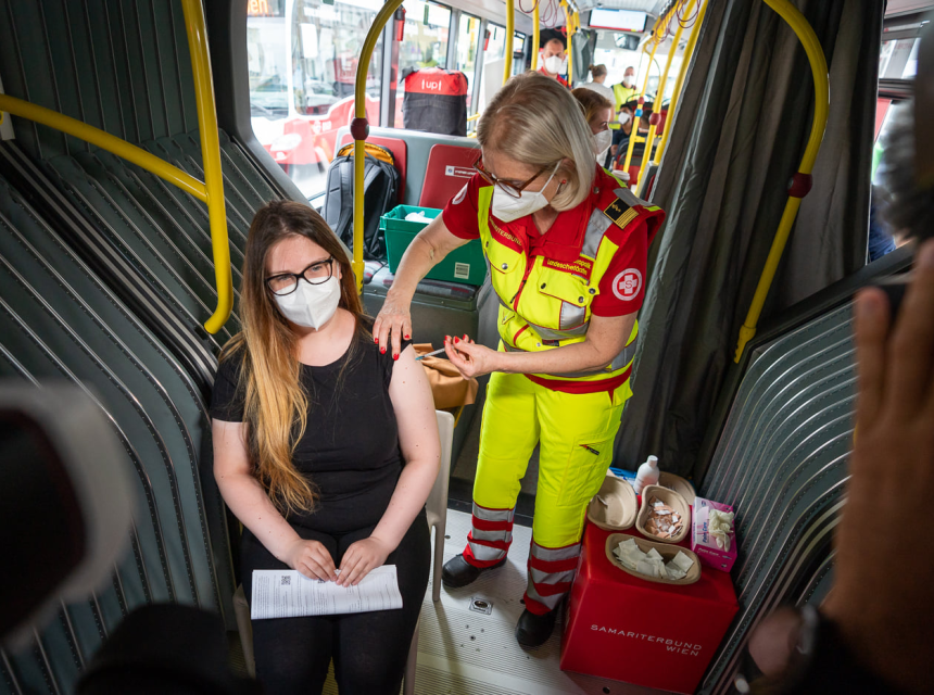 Gradski autobusi u kojima se odvija proces cijepljenja protiv koronavirusa od danas idu i na školske lokacije. Ovaj tjedan cijepljenje protiv koronavirusa obavljat će se na osam lokacija u sedam bečkih kotara.