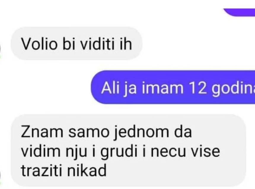 - Tada kreće u akciju. Lani piše kako je lijepa, a potom je pita da razgovaraju putem videopoziva. Djevojčica to odbija, a Muharem joj govori: “Samo jednom da vidim nju i grudi i više neću tražiti nikad”. Iako ga je Lana upozoravala da je ona dijete i ima 12 godina, Muharem je napisao da će se ubiti ako mu ne pošalje sliku.