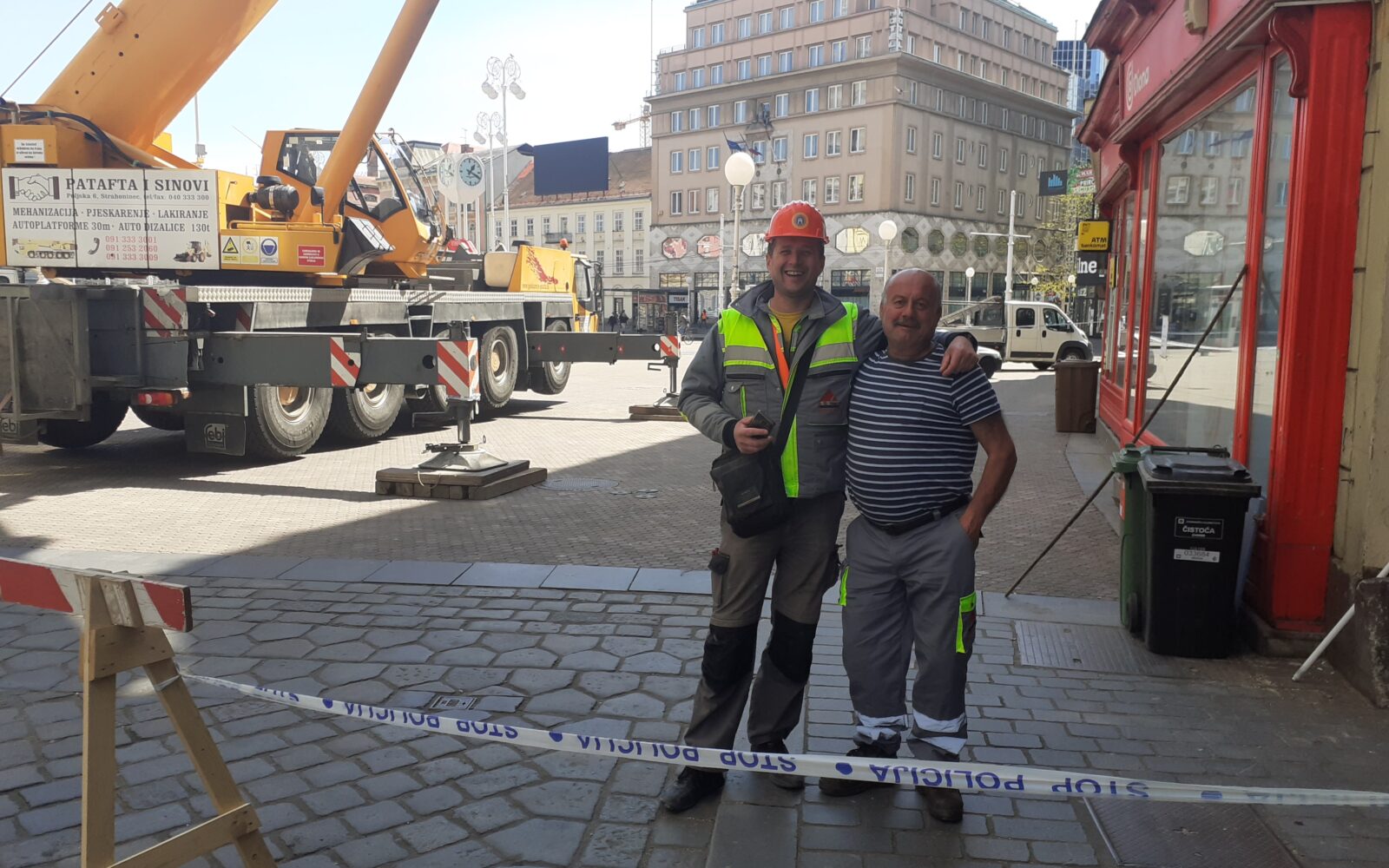 Trg više nije onako sablastan kao prvih dana nakon potresa, no i dalje je pust, a jedine konstante na njemu su dvojica ljudi vezanih uz Bužim, zapadnobosanski gradić smješten između Cazina i hrvatske granice. Jedan je hrvatski ban Josip Jelačić Bužimski, a drugi njegov zemljak Admir Suljić, vlasnik građevinske tvrtke Ases usluge, koja se koristi tim dizalicama za micanje opasnih višetonskih dimnjaka.