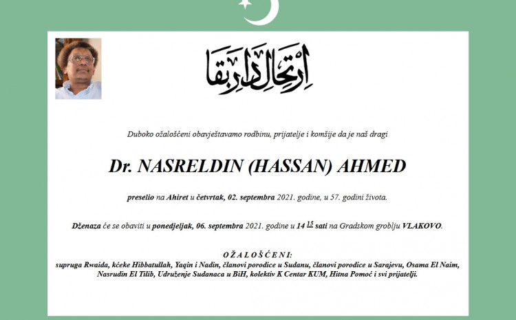 Dženaza će bit će obavljena u ponedjeljak, 6. septembra, na Gradskom groblju Vlakovo.