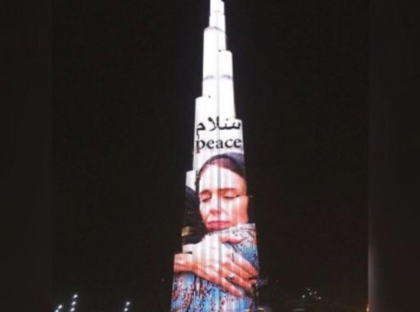 Kao način zahvale od Ujedinjenih Arapskih Emirata, na najvišem tornju na svijetu "Burj Khalifi" prikazana je fotografija Džasinde Ardern kako grli suprugu jednog od ubijenih u masakru.