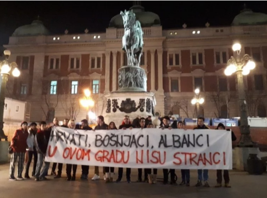 Oni su na Trgu republike u Beogradu razvili transparent na kojem piše "Hrvati, Bošnjaci, Albanci u ovom gradu nisu stranci".