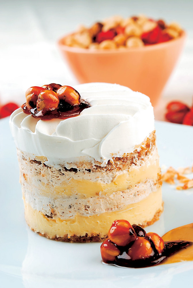 PRIPREMA: Dobro ulupajte bjelanjke i šećer, pa lagano umiješajte brašno i orahe. Preručite u podmazan pleh i sušite na 200 °C dok ne porumeni. Koru podijelite na tri dijela. Za prvi fil stavite mlijeko i šećer da se kuhaju. Žumanjke i brašno dobro umutite i sipajte u ključalo mlijeko koje ste skinuli s vatre. Dobro izmiješajte, vratite na vatru i kuhajte još 7 minuta. Ohlađeni krem sastavite s pjenasto umućenim puterom. Za drugi fil karamelizujte šećer i spustite lješnike, pa izmiješajte. Smjesu preručite u uljem podmazani pleh. Kad se ohladi, sameljite je i sastavite s umućenim šlagom. U okrugle kalupe redajte koru, prvi fil, drugi fil, koru i tako dok ne potrošite materijal. Završite umućenim šlagom.