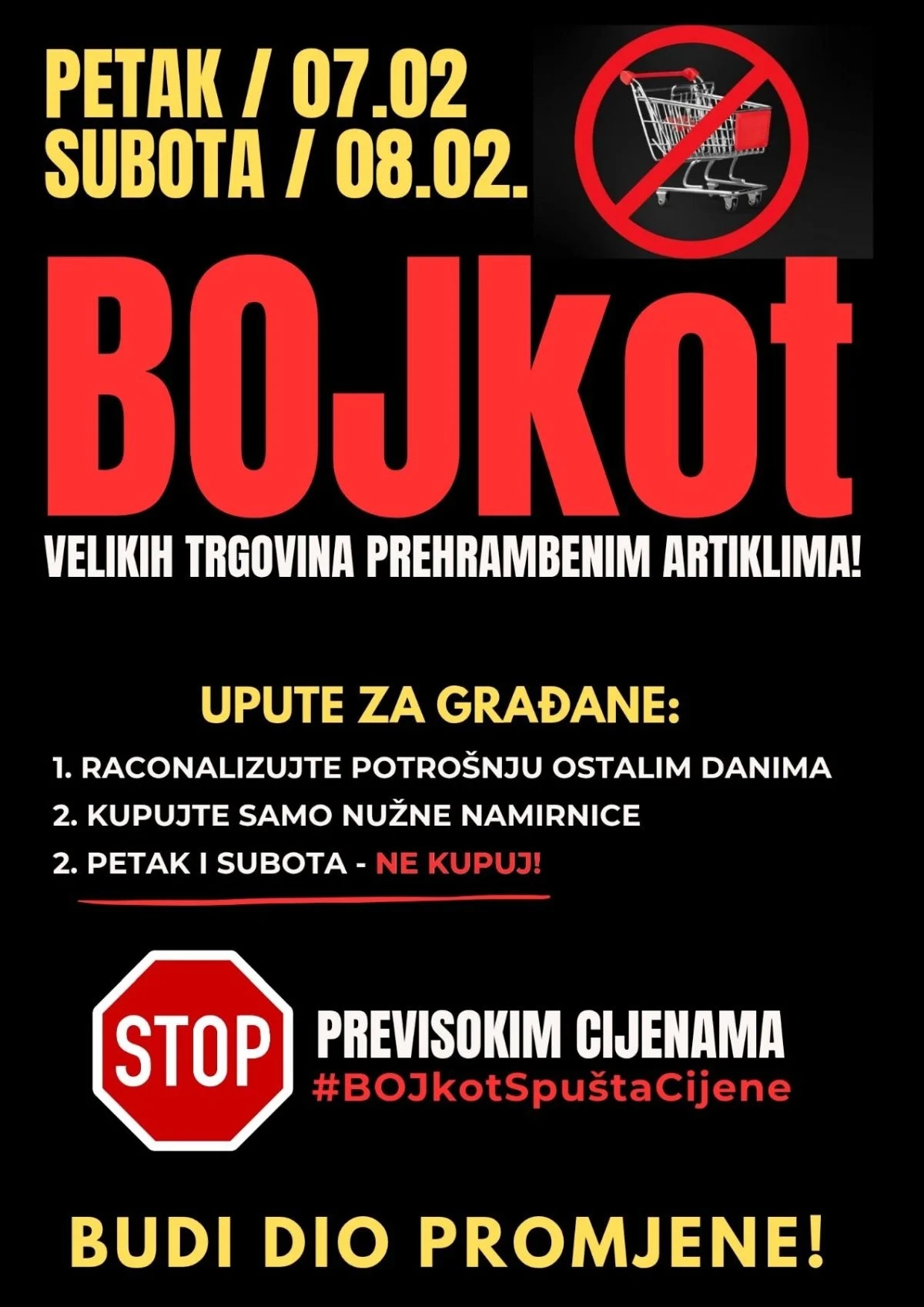 Kako je navedeno u grupi, u petak i subotu, 8. februara građani se pozivaju na bojkot velikih trgovina prehrambenim artiklima.
