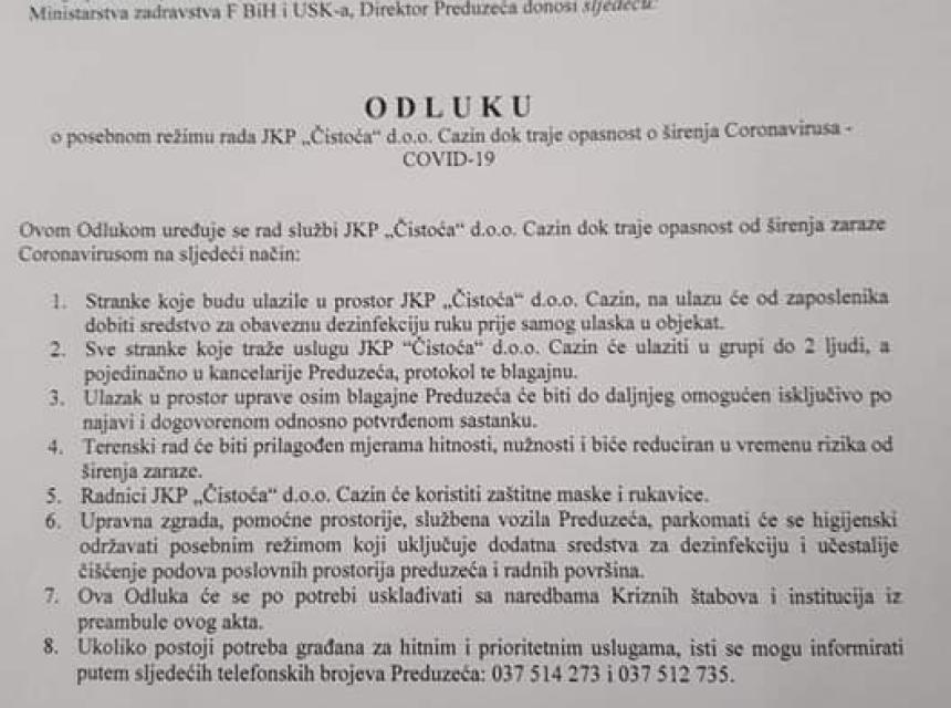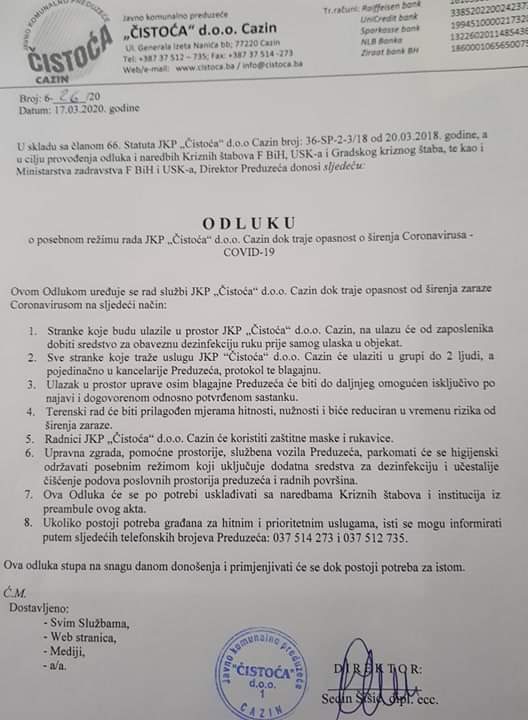 JKP “Čistoća” d.o.o. Cazin je dana 17.03.2020.godine donijela Odluku o posebnom režimu rada dok traje opasnost od širenja Coronavirusa – COVID-19.