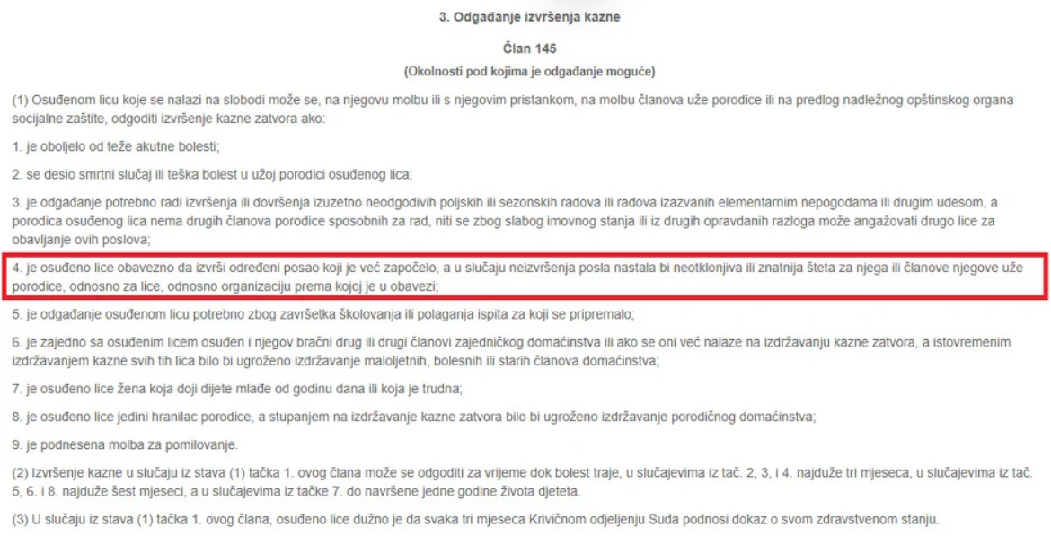 "Principijelno to može biti razlog, naravno ja ne znam konkretno okruženje, ni konkretan posao ali nije sporno kad je u pitanju mogućnosti ili ovlaštenje da se zbog toga traži odgoda. Ali to je opet ograničeno vremenom, to je tri mjeseca i ako nisi riješio to u ta tri mjeseca moraš ići na izdržavanje kazne", ističe Crnalić.
