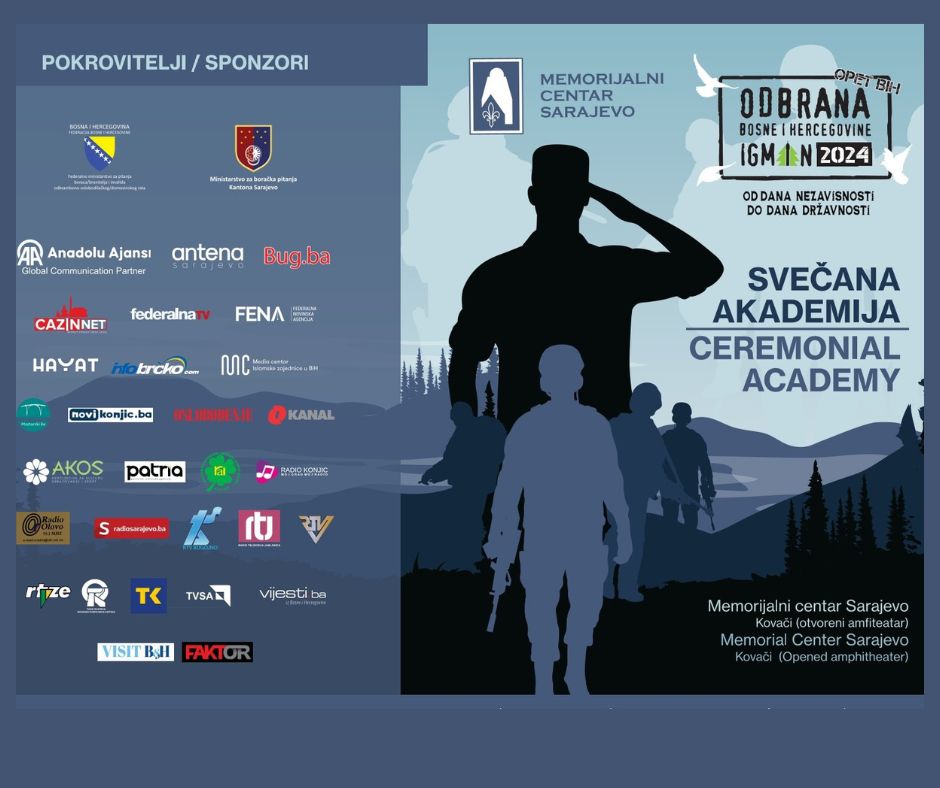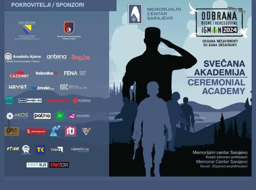 Svečana akademija manifestacije "Odbrana Bosne i Hercegovine - Igman 2024 - Od Dana nezavisnosti do Dana državnosti" održana je večeras na platou vanjskog amfiteatra Multimedijalnog centra Sarajevo na Kovačima.