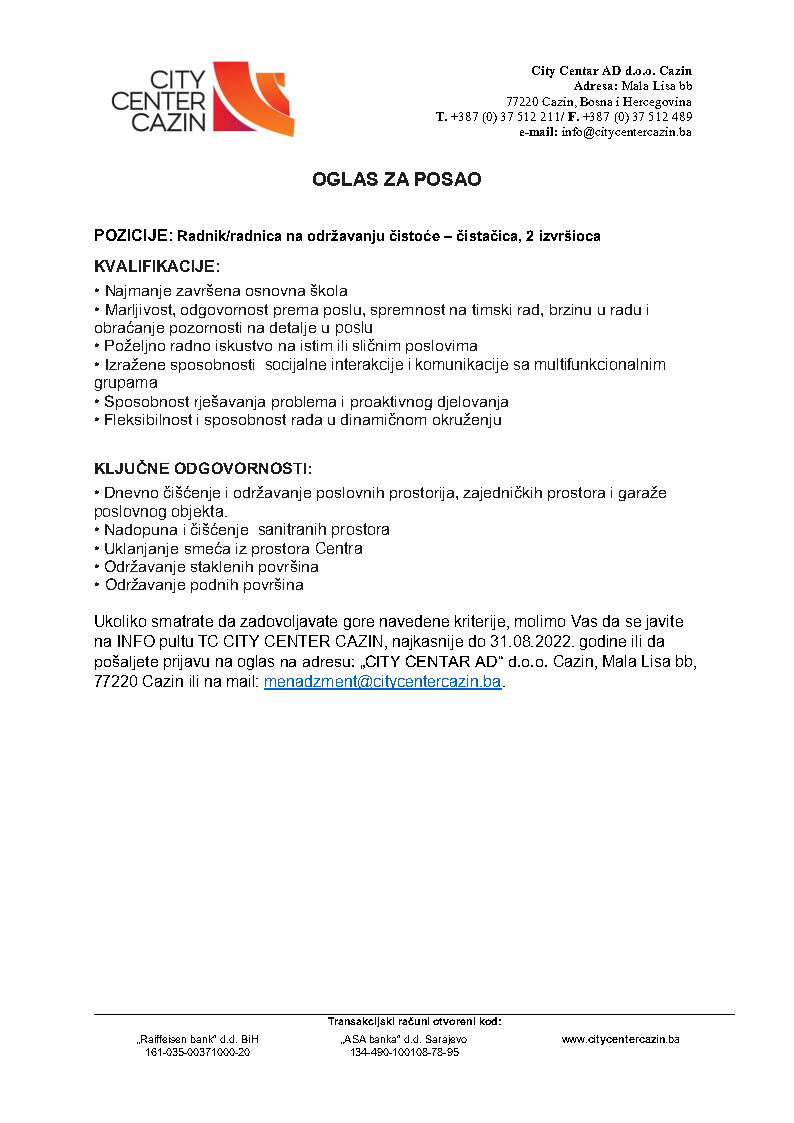 Aktuelnosti 23 Aug, 2022 - 09:25 / Uredio: Market / 0 Comments Oglas za posao u Cazinu Traže se radnici na više pozicija u CITY CENTAR AD d.o.o. Cazin Traže se radnici na više pozicija u CITY CENTAR AD d.o.o. Cazin -Konobari, -Radnici u dječijoj igraonici, -Operater za kontrolu i naplatu parkinga, -Radnik na održavanju čistoće. oglas za posao promo Related Articles Aktuelnosti 02 Dec, 2025 Martin Mane: Balfin Americas – Novo poglavlje u globalnom putu BALFIN Grupe Aktuelnosti CAZIN 23 Nov, 2025 Detalji teške nesreće s Gnjilavca u kojoj je život izgubio Aldin Halkić Aktuelnosti CAZIN 23 Nov, 2025 Tužno jutro u Cazinu: Život tragično izgubio Aldin Halkić Aktuelnosti 20 Nov, 2025 Uključite se i zajedno sa Glade i Bingom pobudite uspomene i stvorite prazničnu čaroliju za SOS Dječija sela u BiH Aktuelnosti 18 Nov, 2025 Zajedništvom do dostojanstvenijeg života osoba s invaliditetom Aktuelnosti KRAJINA 16 Nov, 2025 Važne informacije za vozače: Ogromne gužve na granici, pogledajte gdje se najduže čeka
